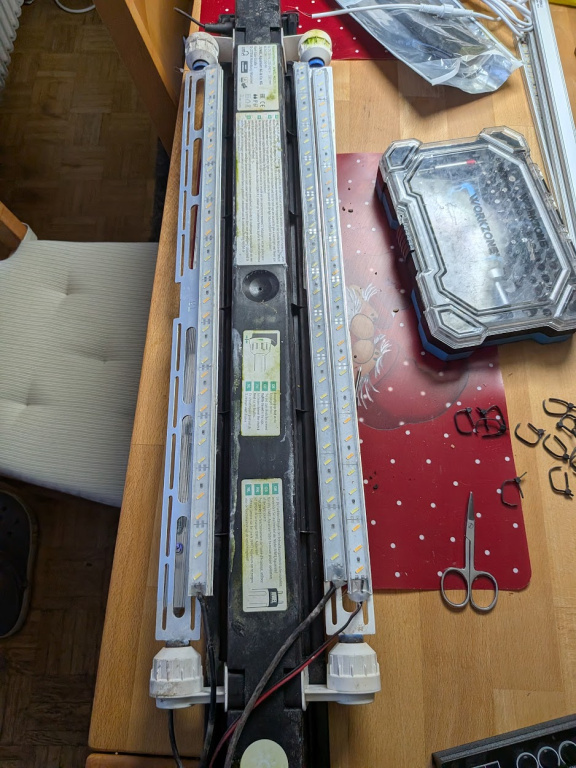 Aus unterschiedlichen Gründen wollte ich diese Leisten mal erneuern. Bisher habe ich Weller und LedAquaristik gemischt, so wie es gerade passte. Ich hatte irgendwie den Wunsch mir eine Chihiro WRGB 800 zu kaufen. 230€ immerhin. Zufällig bin ich dann über einen Beitrag gestolpert, der besagte, dass die FA Weller-LED „The Thrive“ Leds in Leisten packt und diese alsbald verkaufen wollte. So musste ich mich also gedulden.